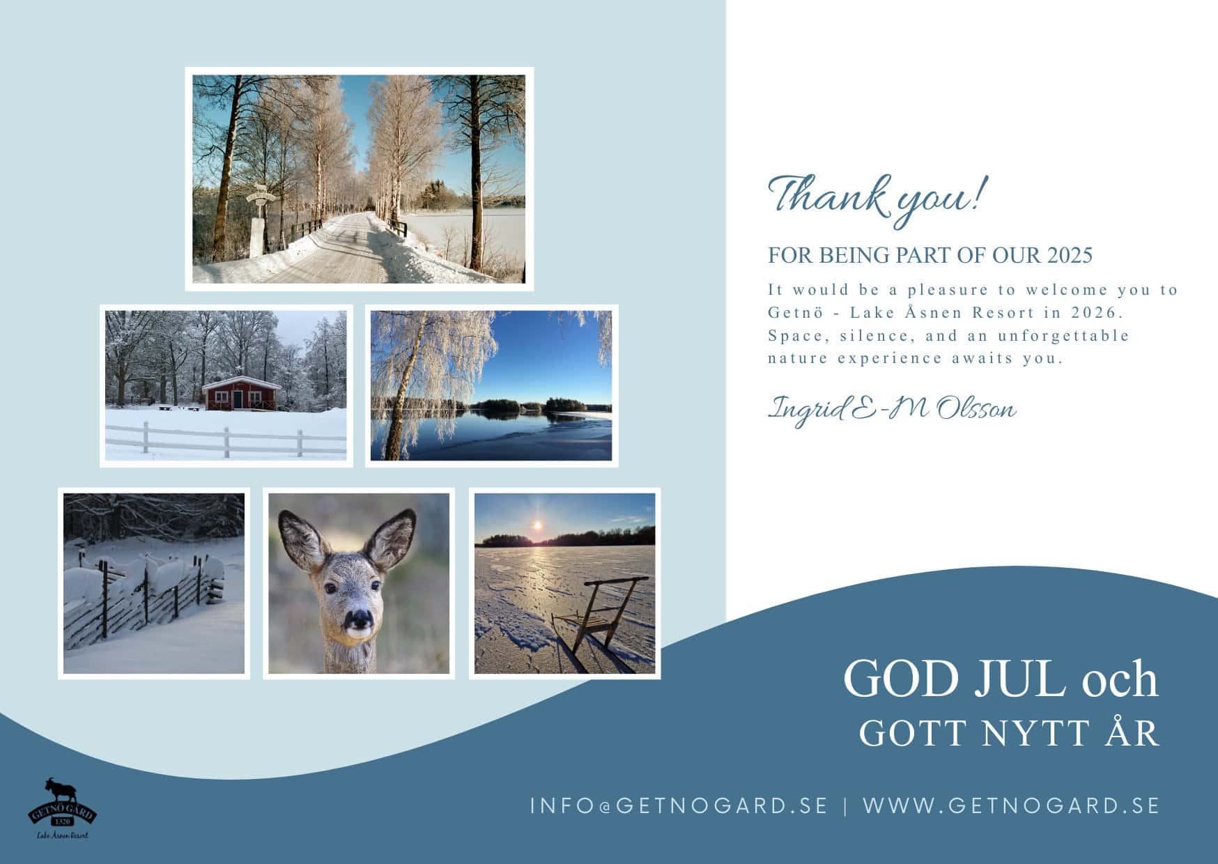 As winter settles over Getnö, the island moves into a quieter rhythm. Looking back, we feel deeply grateful for a wonderful season filled with inspiring guests, meaningful encounters, and a fantastic Team Getnö to work with. As the end of the year approaches, I’d like to take this opportunity to send you warm wishes for the holiday season and all the best for a good new year to come. We hope to welcome you back to Getnö Lake Åsnen Resort in 2026.
